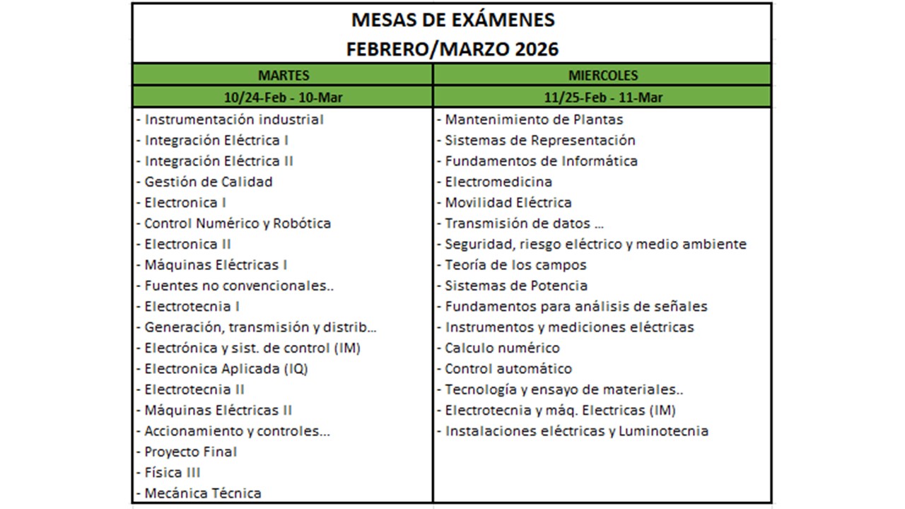 Fechas de mesas de exámenes correspondientes al turno de Febrero - Marzo de 2026.