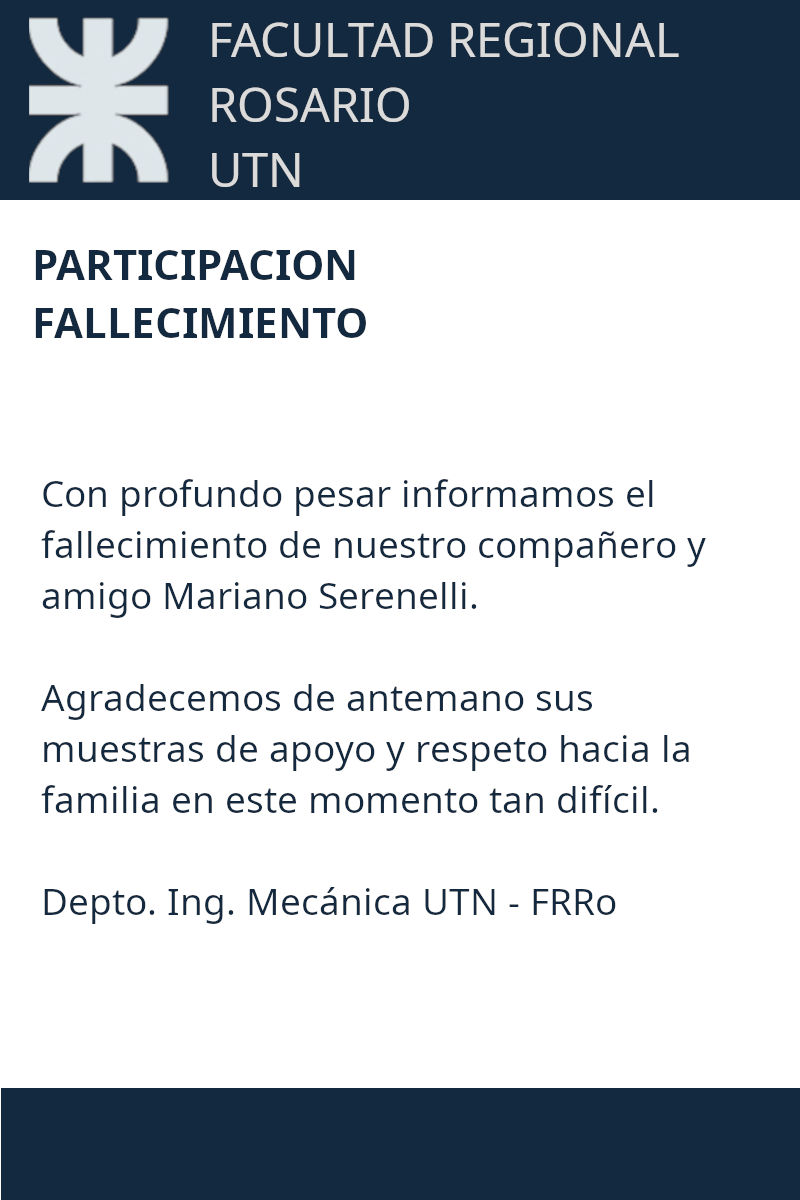 Lamentamos informar a la comunidad educativa de la UTN – Rosario el fallecimiento, ocurrido el 16/04/2025, del Ing. Alberto Romeo, graduado, ex docente de Elementos de Maquinas y Proyecto de maquinas ...